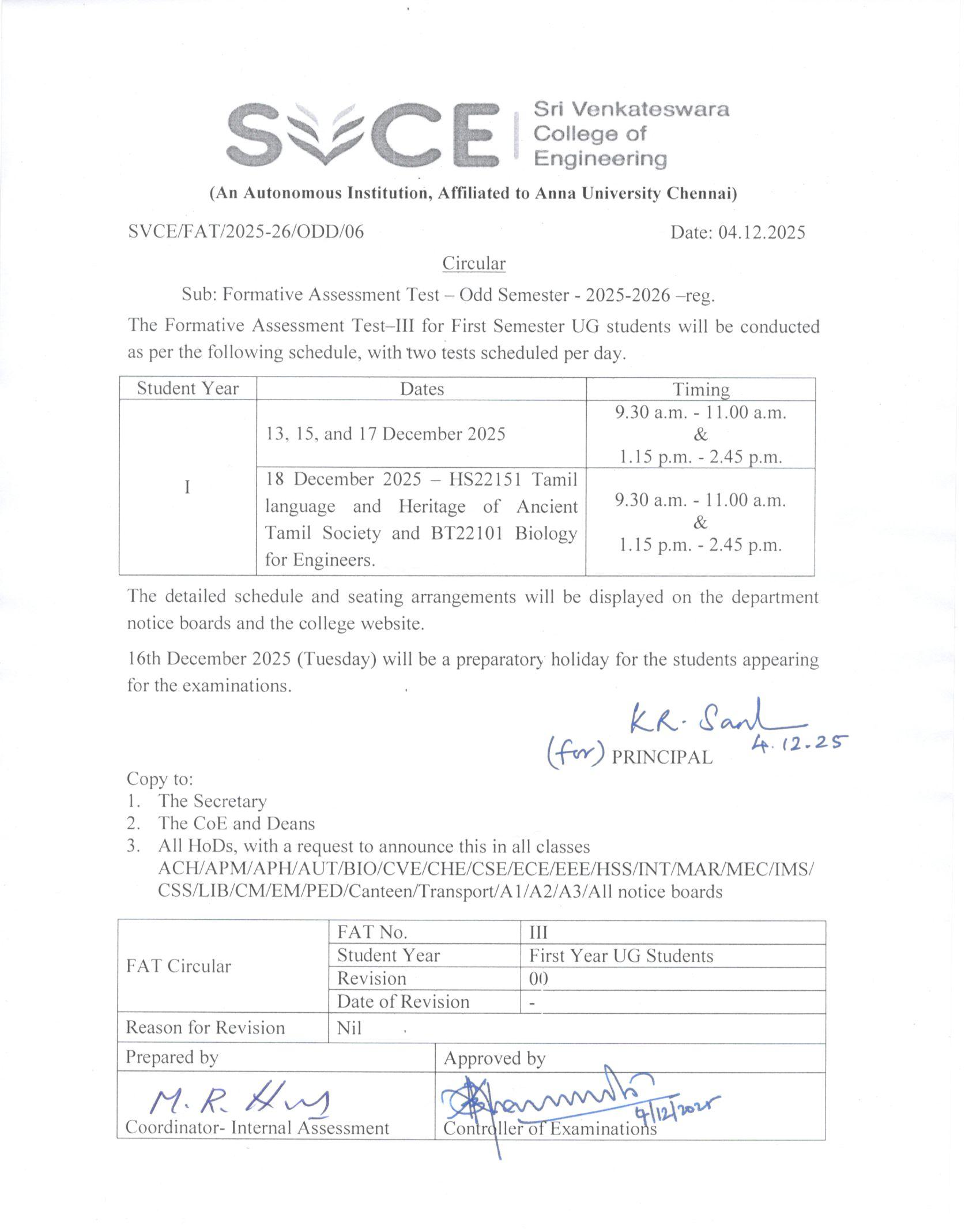 If a student is not satisfied with the result of revaluation, he/she can apply for review through their login credentials on or before 24.08.2025. The students should apply for review along with a Demand draft for Rs. 3000/- (Rupees Three thousands only) per subject, in favor of the Controller of Examination, Sri Venkateswara College of Engineering, payable at Sriperumbudur. Â