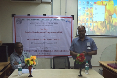 • Six Day Faculty Development Programme on “AUTOMOTIVE AIR - CONDITIONING” organized by Dr. J. Venkatesan, Professor & Head, Dr. V. Ganesh, Associate Professor and Mr. Ramanjaneyulu Kolla, Assistant Professor, Department of Automobile Engineering during 25th November to 30th November 2019, at Department of Automobile Engineering, Sri Venkateswara College of Engineering, Sriperumbudur, Chennai. The Six Day Faculty Development Programme was inaugurated by Dr. P. Shanmugam, Senior General Manager (R & D), Sundaram Fastener Limited, Chennai. He delivered inaugural address on the topic "Introduction to Air-Conditioning and Ozone Layer Depletion". This session was interesting and informative.