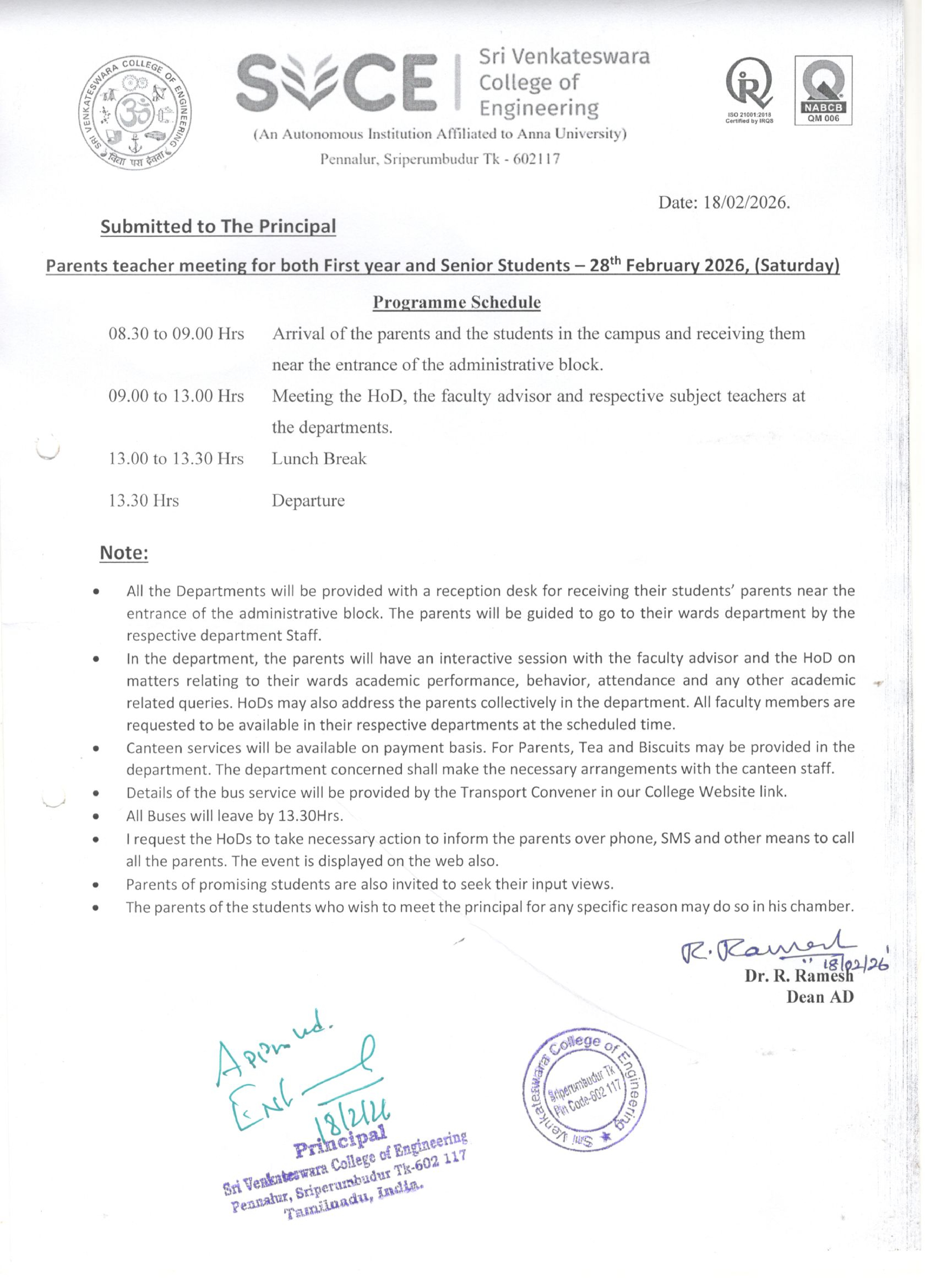 Parent-Teacher Meeting – for both First year and Senior Students (I, II, III and IV year Students) – February 28, 2026 (Saturday)